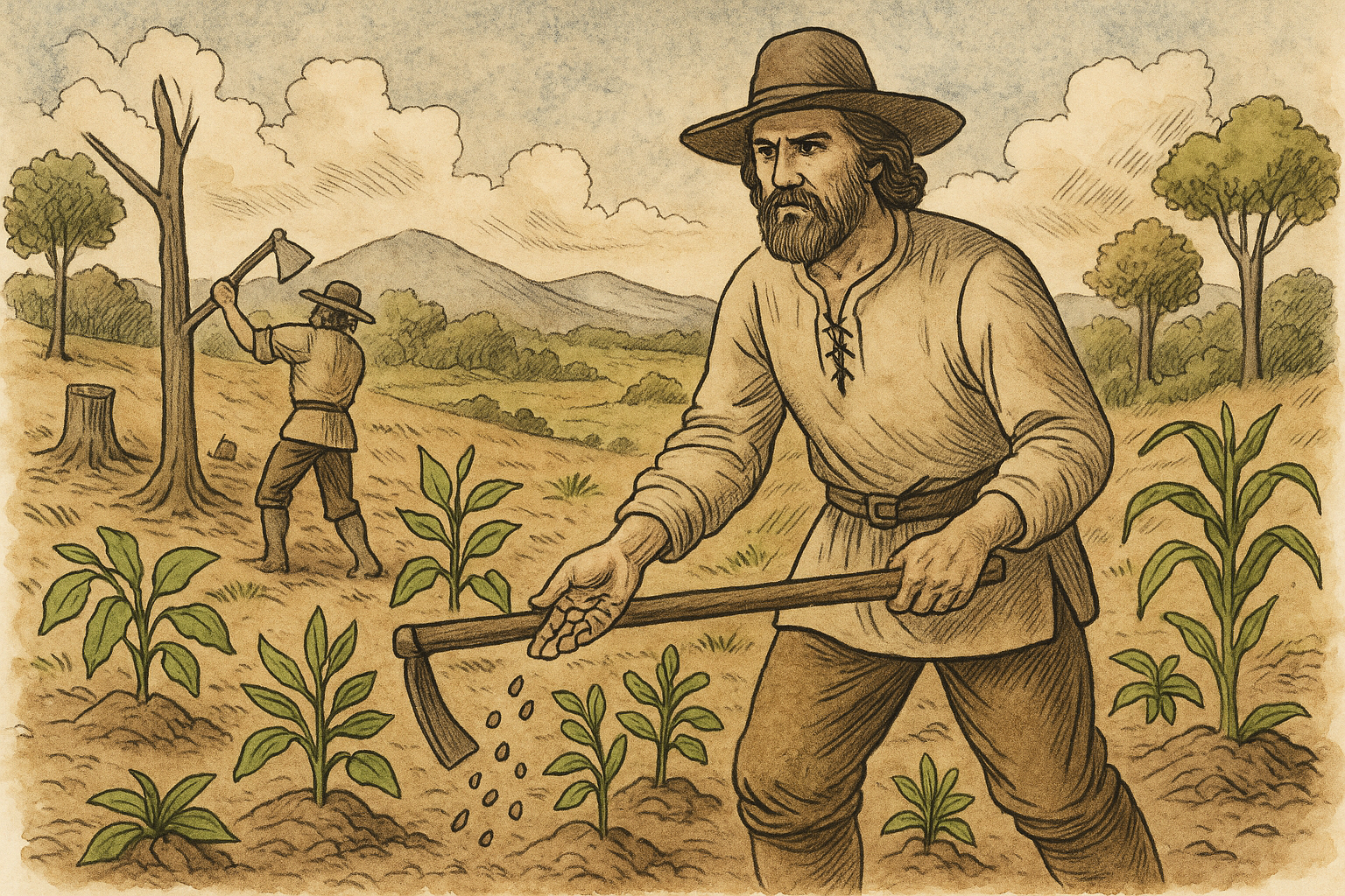 Matias Cardoso de Almeida, vindo na frente de Fernão Dias, faz as roças de milho, feijão, mandioca, etc, no local da atual Belo Vale. (Antonil).